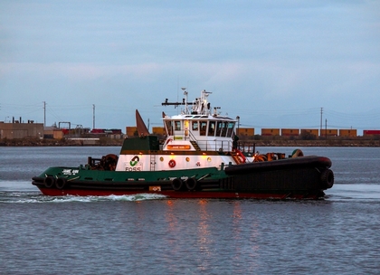 Powered by two, Tier IV compliant MTU 16v4000M65L diesel engines. With Rolls Royce US255 z-drives, outfitted with two, four bladed, 110.24(in), fixed pitch propellers. She is a twin screw tractor tug, rated 6,866 horsepower.
