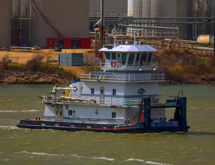 Powered by two, Tier III compliant, Mitsubishi S12R diesel engines. With Twin Disc MG5321 reduction gears, at a ratio of 5.96:1. Turning two, 78 (in) by 64(in), four bladed, stainless steel, fixed pitch propellers. She is a twin screw towboat, rated at 2,200 horsepower.