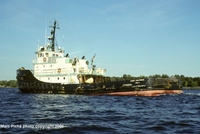 Powered by two, twelve cylinder, EMD 12-645-E64 diesel engines. Turning two, cast steel, fixed pitch propellers. She was a twin screw tug, rated at 3,000 horsepower.